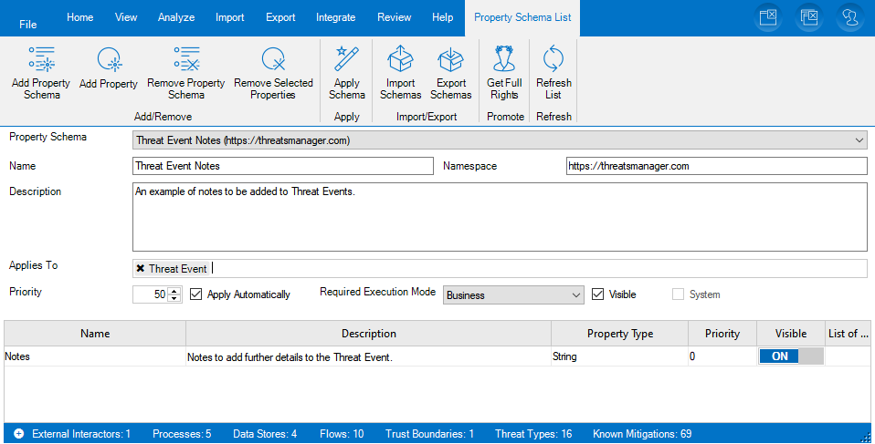 Sometimes you may need to add further clarifications. For example, the Threat Event as described above implies may scenarios without really committing to any. This is of course intentional. But what if you need to keep track about the specific scenarios you have considered? That would be essential, to understand at a later stage the reason why you have selected specific Mitigations and why you have assigned that Severity. To address this need, it is recommended to add metadata to Threat Events, for example as a Notes property. TMS supports the possibility to add metadata on the fly, by using the concept of Property Schemas. So, let’s do that and create a new Property Schema with a Notes property, as shown below.