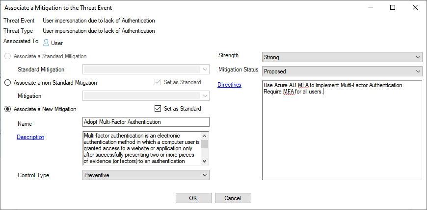 - If no existing Mitigations suits you, click Associate a New Mitigation, fill in the Name and Description, select the most proper Control Type, the Strength and the Mitigation Status, fill in some additional info required using the Directives, and you are done.