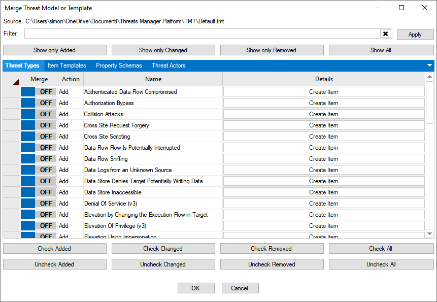 Threats Manager Studio (TMS) includes functionality to evaluate differences between the current Threat Model, and another Threat Model or Template. This functionality is provided by the Merge tool, which allows not only to detect differences but also to selectively merge them with the current Threat Model.
