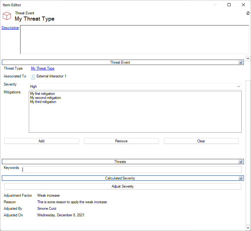 Adjustments allow to compensate the Mitigations and are used to identify situations where the Severity should be different from the calculated one, for some reason. For example, because a storage contains data which is more sensitive than normal, or because there are conditions which make some mitigation less effective. The adjustment is relative to the Mitigations Strength and compensate it. That is, for our example a Weak compensation means that the calculation becomes 75 (High Severity) multiplied for 1 minus 25 (50 points from the Mitigations less 25 from the compensation) divided by 100, which means 56.25, which translates to High. This means that due to this adjustment it is ok now to have High as Severity for the Threat Event, and therefore the Apply Medium Severity button disappears from the Item Editor. You can see below the result.