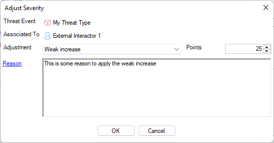 In the previous example, you can see two buttons: the first one with text Apply Medium Severity, and the second one with Adjust Severity. The first button shows the calculated Severity, and it is visible only if it differs from the current Severity for the Threat Event. If you click it, then the proposed Severity is applied to the Threat Event. The second button allows to open the Adjust Severity dialog and specify an adjustment to the evaluation.
