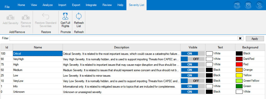 If you open the Severity List, you can see the list of all Severities defined in the Threat Model.