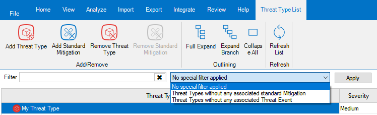 The Threat Type List is the list of all Threat Types and related Mitigations defined in the Threat Model. It is available from the View ribbon.