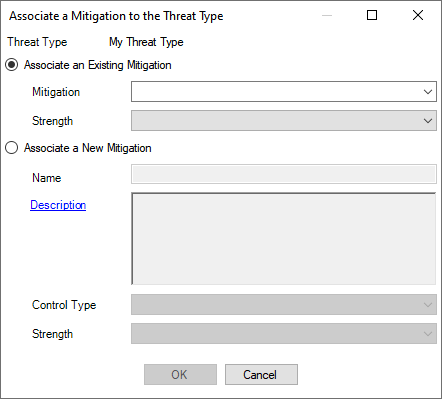 You can also create a new Mitigation, specifying its Name, optionally a Description, its Control Type and the standard Strength of the Mitigation for the Threat Type.