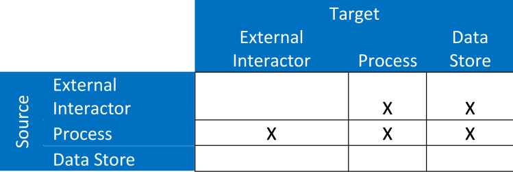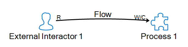 Flows must be drawn from the Entity that originates the request to the destination Entity. As such, legitimate sources are External Interactors and Processes, while any Entity can act as a target for a Flow.