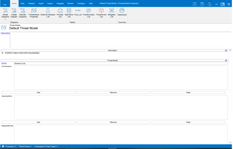 TMS provides a page where you are meant to specify the details related to the Threat Model: Threat Model Properties.