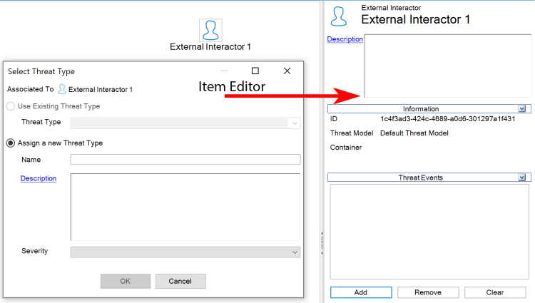 To create a new Threat Event, select an existing Entity or Flow from a diagram or from the respective List in the Home ribbon, then locate the list of the Threat Events associated to the selected object in the Item Editor, click the Add button and select an existing Threat Type or the details of the new Threat Type in the Select Threat Type dialog. This will create the Threat Event associated with the selected object.