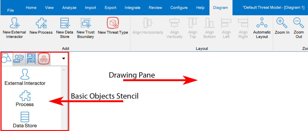 - In diagrams, you can drag & drop the icon of the Trust Boundary from the Basic Objects stencil to the Drawing Pane.