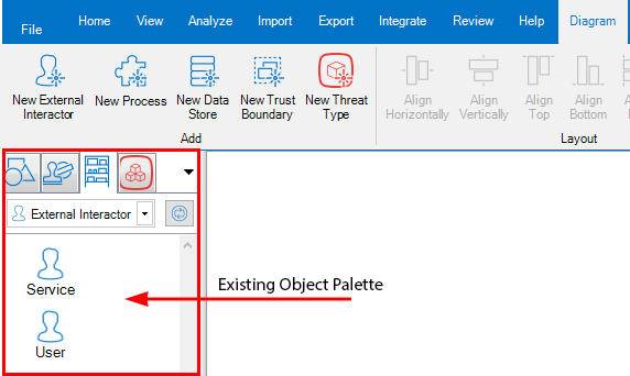 This palette is available in the Diagram tool and allows listing the objects defined in the Threat Model but missing from the current diagram. Therefore, including an object missing from the diagram is only a matter of selecting the Existing Object Palette, select the type of object you are searching for (External Interactor, Process, Data Store, or Trust Boundary), and then dragging it and dropping in the desired position, in the diagram.