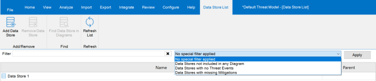 The Data Store List is the list of all Data Stores defined in the Threat Model. It is available from the Home ribbon.